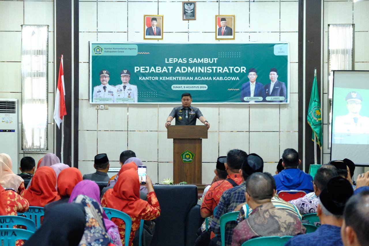 Gowa -lintassulawesinews.com- Bupati Gowa, Adnan Purichta Ichsan didampingi Wakil Bupati Gowa, Abdul Rauf Malaganni menghadiri Lepas Sambut Kepala Kantor Kementerian Agama Kabupaten Gowa, di Aula Kantor Kementerian Agama Kabupaten Gowa, Jum’at (9/8).
