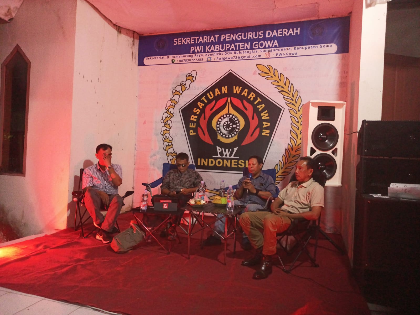 Diskusi dipandu oleh Ivan Kalembang dengan narasumber Riswansyah Muhsin (mantan Komisioner KPID Sulsel), Muhammad Idris alias Baba Ong (konten kreator), serta Andi Baso Tenri Gowa (Pelaksana Tugas PWI Gowa).