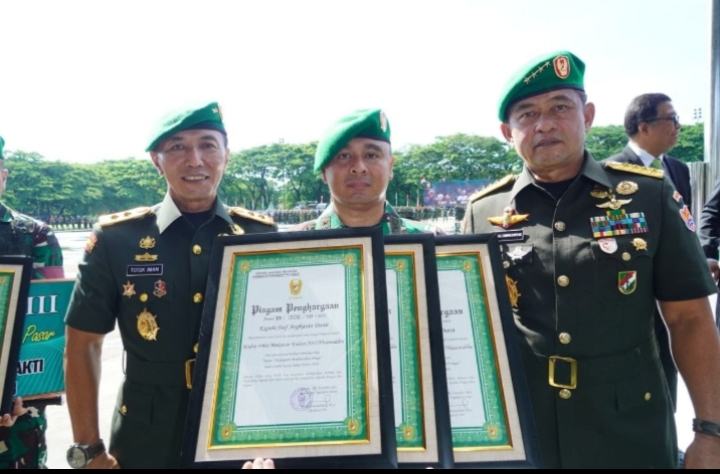 Penghargaan terkait pembersihan dan pelestarian lingkungan kepada Kodim 1408/Makassar diserahkan Kasad Jenderal TNI Maruli Simanjuntak, pada puncak peringatan Hari Juang TNI AD Ke-78 tahun 2023 bertema di Lapangan Karebosi Makassar, Jumat (15/12/2023).