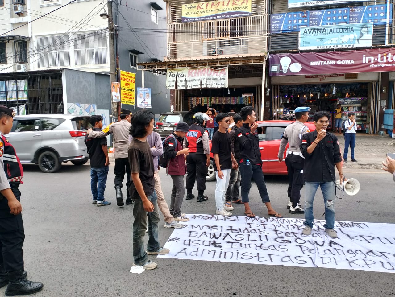 Gowa-lintassulawesinews.com-Puluhan mahasiswa yang tergabung dalam Koalisi Masyarakat Pemerhati Demokrasi melakukan Aksi Demo di depan kantor Bawaslu Gowa, Senin, 18/11/2024.