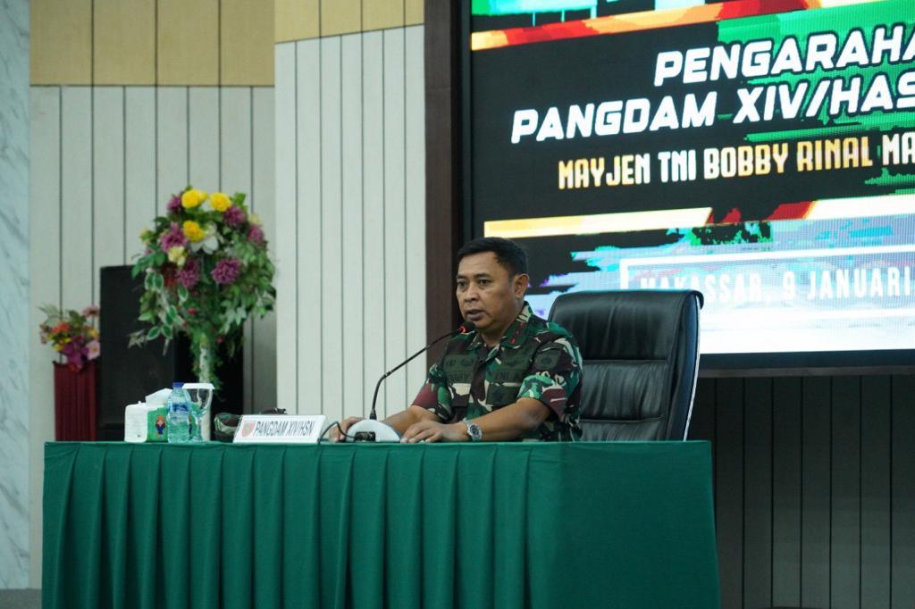 Makassar – lintassulawesinews.com –Pangdam XIV/Hasanuddin Mayjen TNI Bobby Rinal Makmun, S.I.P., memberikan pengarahan kepada para Pejabat Utama (PJU) Kodam, Komandan Satuan (Dansat) dan Kepala Badan Pelaksana Kodam (Kabalakdam), serta sejumlah personel Militer dan PNS Kodam XIV/Hasanuddin yang berada di wilayah Kota Makassar, bertempat di Balai Pertemuan Hasanuddin (BPH) Makodam Jl. Urip Sumoharjo, Kota Makassar. Selasa, (9/01/2024).