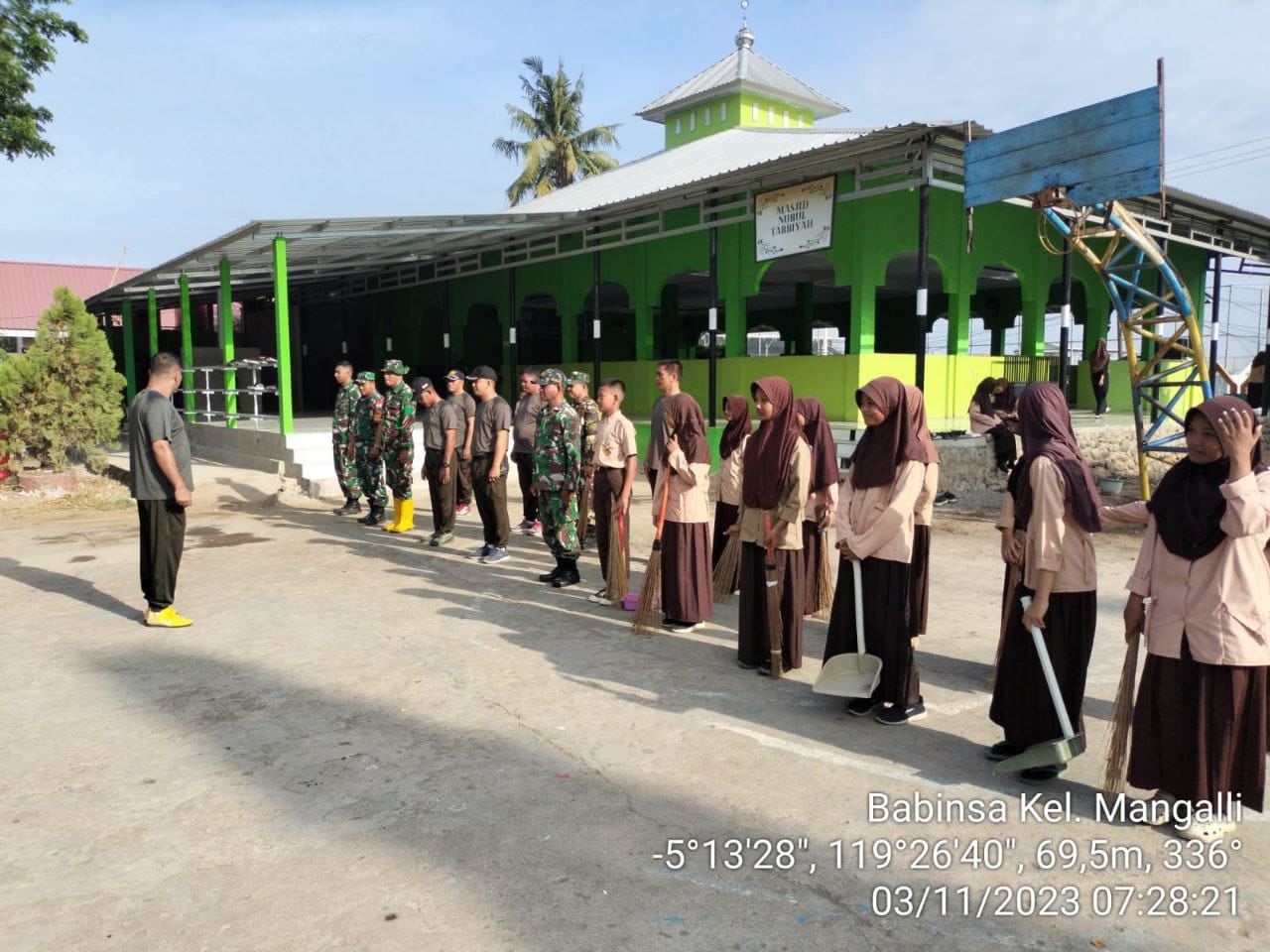 Gowa – lintassulawesnews.com – Personel Koramil 1409-05/Pallangga, Kodim 1409/Gowa melaksanakan kegiatan Karya Bhakti atau gotong royong dengan para Siswa Siswi SMPN 1 Pallangga di Masjid Nurul Tarbiyah SMPN 1 Pallangga Kel. Mangalli Kec. Pallangga Kab. Gowa. Jumat (03/11/2023).
